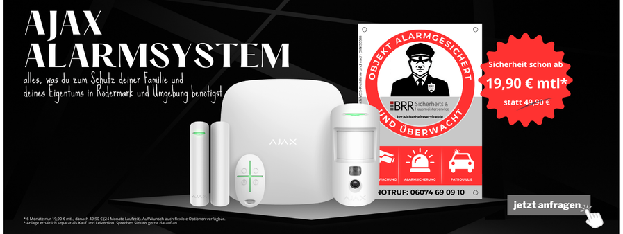 AJAX Alarmsystem mit Hub, Bewegungsmelder, Türsensor, Fernbedienung und BRR-Sicherheitsschild; Angebotsbadge „ab 19,90 € mtl.“; Hinweis „jetzt anfragen“ für Rödermark und Umgebung.